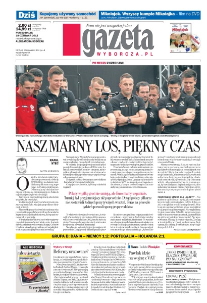 Polacy w piłkę grać nie umieją, ale Euro mamy wspaniałe – turniej był przyjemniejszy niż poprzednie, ale polscy piłkarze nie zostawiali żadnych pozytywnych wrażeń; ile pracuje nauczyciel; zagadka śmierci twórcy GROM; brak zdecydowanego zwycięzcy we wczorajszych wyborach sprawia, że polityczny chaos w Atenach jeszcze długo będzie straszył Europę i rynki finansowe; aresztowania autorów patriotycznych piosenek to kolejna odsłona wojny kulturowej w Tybecie; Monika Koperska, doktorantka z Uniwersytetu Jagiellońskiego, zdobyła drugie miejsce i nagrodę publiczności w międzynarodowym konkursie FameLab; kupno używanego samochodu to prawdziwe wyzwanie, pełne pułapek, których nie wolno bagatelizować – ostrożność i rozwaga mogą uchronić przed oszustwem albo nieprzewidzianymi wydatkami.