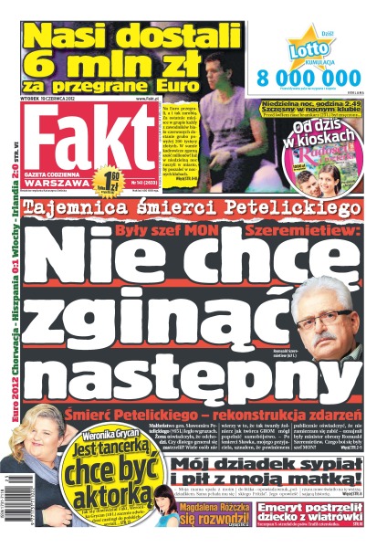 Nasi piłkarze dostali 6 mln zł za przegrane Euro; tajemnica śmierci generała Petelickiego; w jakich warunkach ministrowie z PSL oglądali mecz; za półtora roku wyjazd nad morze będzie kosztował dodatkowo 45 zł; niedźwiedź Wania przeszedł operację usunięcia aż sześciu chorych i bolących zębów; Edyta Górniak Zabiera Allanka do Tybetu; podopieczni Franciszka Smudy po klęsce na mistrzostwach nie stracili humoru – każdy z nich dostał spore pieniądze, była więc okazja by wyrwać się do miasta i poszaleć trochę w modnych miejscach stolicy; niemal nazajutrz po klęsce na Euro 2012 zaczęła się walka o posadę selekcjonera biało-czerwonych; piłkarze Slavena Bilicia mieli znakomite okazje w meczu