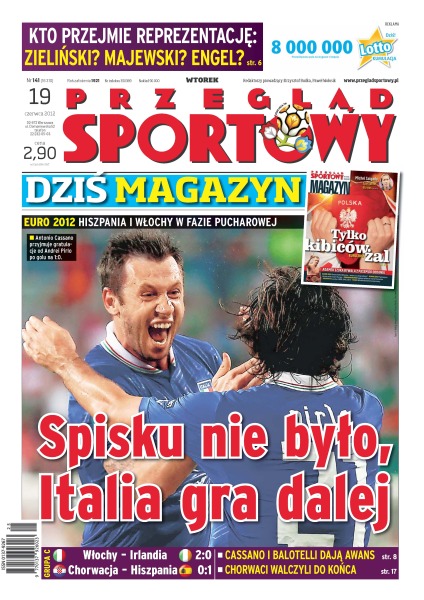 Polscy piłkarze mieli wznieść się na wyżyny umiejętności, a nawet zagrać lepiej niż potrafią – tylko wtedy mogli odnieść sukces i awansować z grupy do dalszej fazy turnieju – niestety nie udało się; szefowie związku nie mają kandydata na następcę Franciszka Smudy, a zanim go znajdą, kadrę może prowadzić dotychczasowy asystent Jacek Zieliński; w obozie Holendrów trwa analiza, co było przyczyną klęski niedawnej potęgi; dzięki zwycięstwu swojemu i Hiszpanów Italia zostaje w turnieju; Krzysztof Szramiak za stosowanie dopingu może zostać zdyskwalifikowany dożywotnio; LeBron James i Dwyane Wade poprowadzili Miami Heat do wygranej z Oklahoma City Thunder w pierwszym z trzech meczów u siebie – zespół z Florydy prowadzi w finale NBA 2–1; zespół Bilicia twardo walczył, ale pożegnał się z EURO; Wayne Rooney przez kilka minut wpatrywał się w zdjęcia Donbas Areny, następnie zapytał, w jakich strojach zagrają obie drużyny, by łatwiej było mu wyobrazić sobie, jak strzela gole.