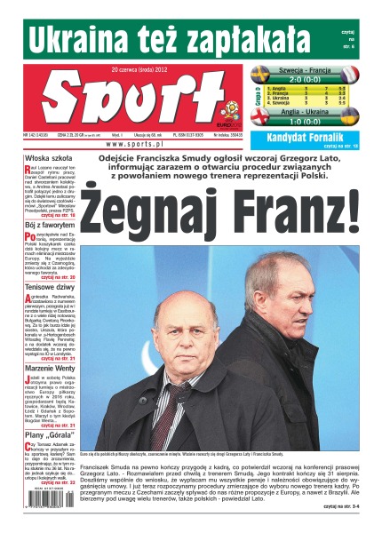 Odejście Franciszka Smudy ogłosił wczoraj Grzegorz Lato, informując zarazem o otwarciu procedur związanych z powołaniem nowego trenera reprezentacji Polski; czy Grzegorz Lato złamie swą deklarację sprzed kilku miesięcy o niekandydowaniu na kolejną kadencję; drugi ze współgospodarzy pożegnał się z Euro 2012; na Euro 2012 przyjechało aż 32 tysiące kibiców z Irlandii – pod tym względem przebili wszystkie inne nacje; Iker Casillas znów jest bohaterem Hiszpanii; sternik polskiej siatkówki nie boi się stwierdzenia, że biało-czerwonych zalicza się obecnie do trójki najlepszych reprezentacji na świecie; Katowice, Kraków, Wrocław, Łódź i Gdańsk z Sopotem będą gościć uczestników mistrzostw Europy piłkarzy Ręcznych w 2016 roku.