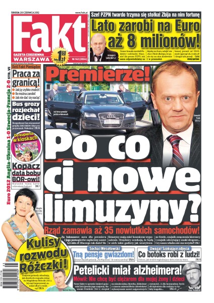 Szef PZPN twardo trzyma się stołka – zbija na nim fortunę i tylko na Euro zarobi aż 8 milionów; rząd zamawia aż 35 nowiutkich samochodów; czy Petelicki był bankrutem i czy została mu tylko emerytura; Ewa Kopacz jeździ na rowerze w obstawie BOR; w czwartek pierwszy dzień astronomicznego lata; Donatella Versace bez botoksu; Michał Marzec bardziej niż domem i rodziną interesował się życiem towarzyskim; Karolina i jej mąż Olivier Janiak mają już dwóch synów, ale od dawna marzyli o córeczce – czy wreszcie się jej doczekają; Franciszek Smuda definitywnie kończy pracę z kadrą z końcem sierpnia – na odchodne dostanie dwie pensje i premię, która będzie wyższa od tej dla piłkarzy; dlaczego podczas meczu Hiszpania – Irlandia w strefie dla VIP-ów zabrakło nagle czystej wódki; Grzegorz Lato upasł się na Euro i zarobi osiem milionów, a do wzięcia ma jeszcze milion euro premii od UEFA.