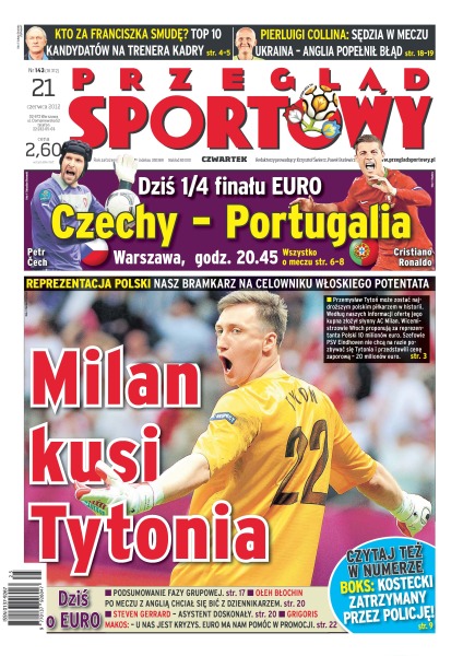 Przemysław Tytoń może zostać najdroższym polskim piłkarzem w historii – według naszych informacji ofertę jego kupna złożył słynny AC Milan; czy z polskich trenerów nie ma lepszego kandydata do przejęcia kadry niż Jerzy Engel; dlaczego czescy dziennikarze mają problem z Petrem Czechem; czy Dawid Kostecki zatrzymany 30 czerwca w Łodzi zmierzy się ze słynnym Royem Jonesem Jr.; w czwartek rozegra się walka o mistrzostwo Polski w jeździe indywidualnej na czas; Ołeh Błochin po porażce z Anglią 0:1 nie zostawił suchej nitki na sędziach i wyzwał dziennikarza na pojedynek; zagraniczne media chwalą Polskę za organizację EURO 2012.