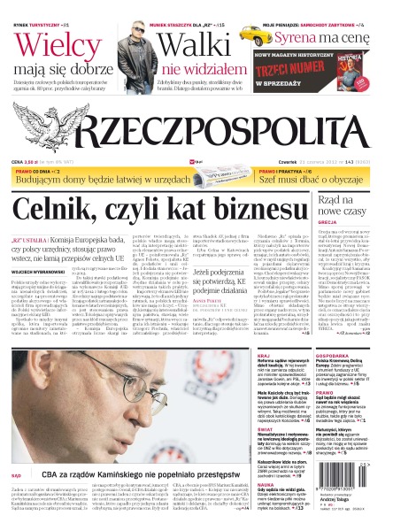 Komisja Europejska bada, czy polscy urzędnicy, stosując prawo wstecz, nie łamią przepisów celnych UE; PSL wytacza coraz cięższe działa w walce z pomysłem Gowina na reformę małych sądów; działa już nowy rząd, ale nie wiadomo, czy zdoła zaspokoić oczekiwania zmęczonych reformami Greków; szczyt Rio+20 utonął w oparach absurdu; coraz więcej armii byłych republik sowieckich wybiera zachodni sprzęt, a Kałasznikow idzie na złom; jaki jest sposób na uniknięcie kompromitujących pomyłek na boisku; dziś w Warszawie pierwszy ćwierćfinał; dziesięciu czołowych polskich touroperatorów zgarnia ok. 80 proc. przychodów całej branży; Polacy polubili e-booki – nasz rynek wzrośnie w ciągu najbliższych pięciu lat bardziej niż globalny, bo aż 11-krotnie.