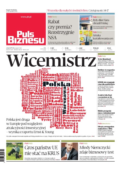 Producenci nie wiedzą, jak podatkowo traktować nagrody dla najlepszych dystrybutorów; właściwa polityka cenowa może znacząco zwiększyć zyski; Polska jest druga w Europie pod względem atrakcyjności inwestycyjnej – wynika z raportu Ernst & Young; grupa 3J zajmująca się budową szpitali jest kolejną ofiarą kataklizmu w branży – bez szans na układ z wierzycielami; prezes firmy Netline informatycznej, podejrzany o wręczanie łapówek, przekonuje, że spółka padła ofiarą nietrafionych skojarzeń; UOKiK nie rezygnuje z kar dla szefów firm; 4 mld zł dla Enei z uczuciem w tle; EURO 2012 i zastój w budownictwie mieszkaniowym pogłębiły sezonowy dołek w branży; wielkie dramaty najmniejszych