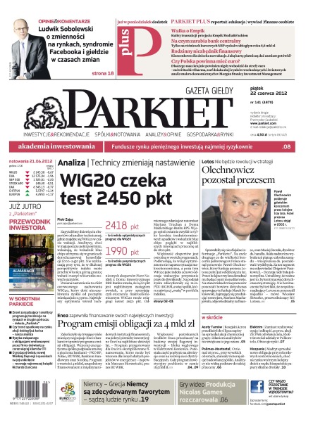 WIG20 zyskał już w czerwcu 10 proc. – analitycy techniczni nie wykluczają, że indeks szykuje się do wybicia z kilkumiesięcznego marazmu; Enea zapewni finansowanie swoich inwestycji przez najbliższe dziesięć lat, emitując obligacje i zaciągając pożyczki w międzynarodowych instytucjach finansowych; Olechnowicz nadal kieruje Lotosem; Elektrim obiecuje zysk, także z Polkomtelu; jak niektóre fundusze gotówkowe w ciągu jednego dnia straciły kilkumiesięczne zyski; Madryt rekordowo dużo zapłacił za nowe pożyczki z rynku, ale rentowność jego starych obligacji maleje.