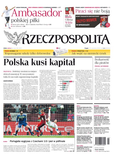 Jesteśmy uważani za miejsce dobrych inwestycji – jednak w rzeczywistości trafia do nas mało zagranicznego kapitału; badacze nadal muszą mozolnie odtwarzać listę ofiar NKWD z Mińska; mimo zakazu handlu biletami czarny rynek w Internecie kwitnie; strefa euro musi zmierzać w kierunku prawdziwej unii bankowej i fiskalnej – zaapelował wczoraj MFW; Barack Obama broni przed Kongresem swego prokuratora generalnego; Amerykanie nakręcili horror o Czarnobylu, a Europa Wschodnia nie rozliczyła się jeszcze z ukraińską tragedią; jedna z najpiękniejszych królewskich rezydencji w Europie może konkurować z Wersalem; dziś wieczorem w Gdańsku zagrają Niemcy z Grecją; kapitan Cristiano Ronaldo daje swojej drużynie półfinał.