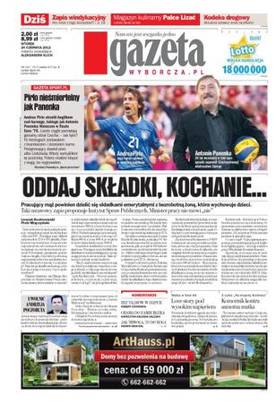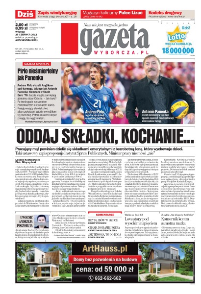 Pracujący mąż powinien dzielić się składkami emerytalnymi z bezrobotną żoną, która wychowuje dzieci – taki ustawowy zapis proponuje Instytut Spraw Publicznych; walka na haki wEneiSA; wiceszef BOR-u oskarżony za Smoleńsk; pabianicki sąd uznał wczoraj, że lobbysta Marek D. I jego asystent Krzysztof P. skorumpowali posła SLD Andrzeja Pęczaka; Andrea Pirlo strzelił Anglikom cud-karnego, takiego jak Antonín Panenka Niemcom w finale Euro ’76.