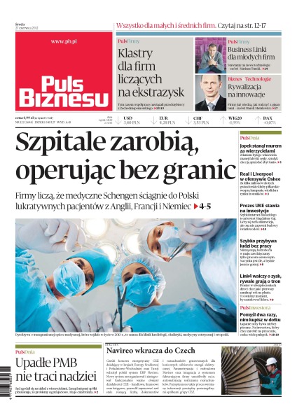 Firmy liczą, że medyczne Schengen ściągnie do Polski lukratywnych pacjentów z Anglii, Francji i Niemiec; firmy już wiedzą, jak walczyć z gigantami — mówi Marek Matulewicz; Jopek stanął murem za wierzycielami; prezes UKE stawia na inwestycje; szybko przybywa ludzi bez pracy – niższą stopę bezrobocia w maju zawdzięczamy tylko pracom sezonowym; Link4 walczy o zysk, rywale grają o tron; wszystko dla małych i średnich firm.