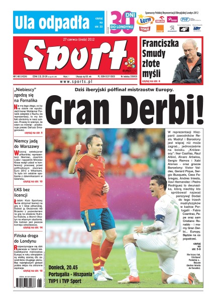 Dziś iberyjski półfinał mistrzostw Europy – Portugalia zmierzy się z mocnymi Hiszpanami; jeśli trener Waldemar Fornalik odejdzie z Ruchu do reprezentacji to prezes „Niebieskich” nie będzie smutny; wczoraj selekcjoner piłkarskiej reprezentacji Niemiec, Joachim Loew i napastnik Miroslav Klose wzięli udział w konferencji prasowej przed półfinałowym starciem Euro 2012 z Włochami; Łódzki Klub Sportowy nie otrzymał licencji na grę w I lidze piłkarskiej; rozpoczynające się dziś pierwsze w historii lekkoatletyczne mistrzostwa Europy w roku olimpijskim są wielką szansą dla za-wodników drugiego planu.