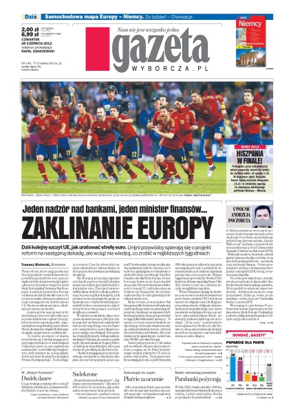Dziś kolejny szczyt UE, jak uratować strefę euro – unijni przywódcy spierają się o projekt reform na następną dekadę, ale wciąż nie wiedzą, co zrobić w najbliższych tygodniach; studenci Politechniki Rzeszowskiej protestują przeciwko słabemu poziomowi nauki języków obcych na ich uczelni; dziesięć lekcji,jak przetrwać na paryskim bruku; prezydent Paragwaju wyłożył się na latyfundiach; Hiszpania w finale Euro 2012 – Portugalia przez kilkadziesiąt minut zmuszała obrońców tytułu do ciężkiej walki, aż opadła z sił.