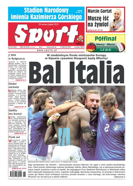 W niedzielnym finale mistrzostw Europy w Kijowie rywalem Hiszpanii będą Włosi, którzy we wczorajszym półfinale pokonali Niemców 2:1; Stadion Narodowy imienia Kazimierza Górskiego; jeszcze co najmniej sześć spotkań rozegra w tym roku piłkarska reprezentacja Polski; GKS Katowice bez licencji na grę w pierwszej lidze.