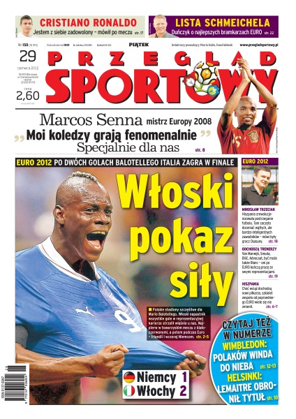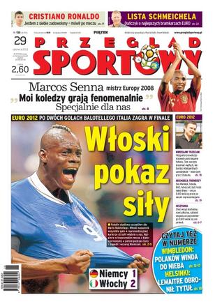 Włosi pokonali w półfinale Niemców 2:1 i to oni zagrają z Hiszpanią w wielkim finale mistrzostw Europy; jestem z siebie zadowolony – mówił po meczu Cristiano Ronaldo; lista Schmeichela – Duńczyk o najlepszych bramkarzach EURO; dlaczego Hiszpania zrewolucjonizowała postrzeganie futbolu; Van Marwijk, Smuda, Bilić, Advocaat, być może także Blanc – oni po EURO kończą pracę ze swymi reprezentacjami.