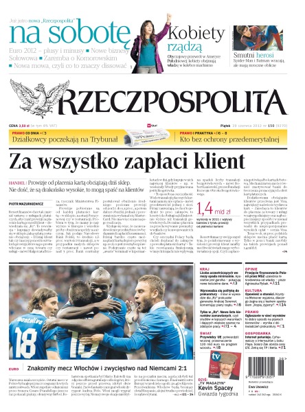Prowizje od płacenia kartą obciążają dziś sklep – nie dość, że są drakońsko wysokie, to mogą spaść na klientów; działkowcy poczekają na Trybunał; kto bez ochrony przedemerytalnej; liczba uczestniczących we mszy spada minimalnie – apostatów jest garstka, pokazują nowe kościelne dane; Krystyna Meissner wyjaśnia, dlaczego żegna się z teatrem spektaklem „Hopla, żyjemy!”;znakomity mecz Włochów i zwycięstwo nad Niemcami 2:1.