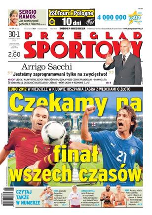 W niedzielę w Kijowie Hiszpania zagra z Włochami w finale Euro 2012; Agnieszka Radwańska awansowała do IV rundy turnieju na kortach Wimbledonu; Anita Włodarczyk wygrała kwalifikacje w rzucie młotem podczas mistrzostw Europy; w sobotę w Łodzi Paweł Głażewski walczy z Royem Jonesem Jr.