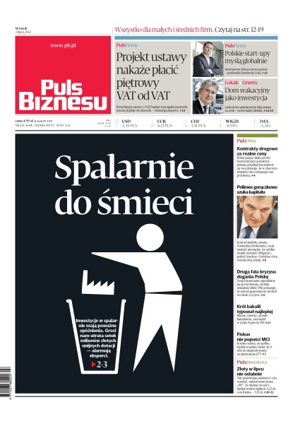 Nowelizacja ustawy o VAT będzie wymagała poprawki, inaczej dojdzie do absurdu — wskazują eksperci; polskie start-upy myślą globalnie – internetowy biznes nie ma granic; luksusowe apartamenty dają szansę na zysk — mówi Rafał Zdebski; inwestycje w spalarnie mają poważne opóźnienia – grozi nam utrata setek milionów złotych unijnych dotacji; fiskus nie popuści MCI – rośnie ryzyko, że spółka będzie musiała oddać 46,5 mln zł odszkodowania za zniszczenie JTT.