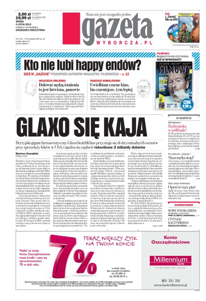 Brytyjski gigant farmaceutyczny Glaxo Smith Kline przyznaje się do kryminalnych oszustw przy sprzedaży leków w USA i zgadza się zapłacić rekordowe 3 miliardy dolarów; jest szansa, że projektami ustaw o związkach partnerskich i orzeczniku ds. przeciwdziałania dyskryminacji zajmie się cały Sejm.; jak wygląda nowe oblicze polskiej biedy; rozmowa z Markiem Sawickim; Radwańska w półfinale Wimbledonu.
