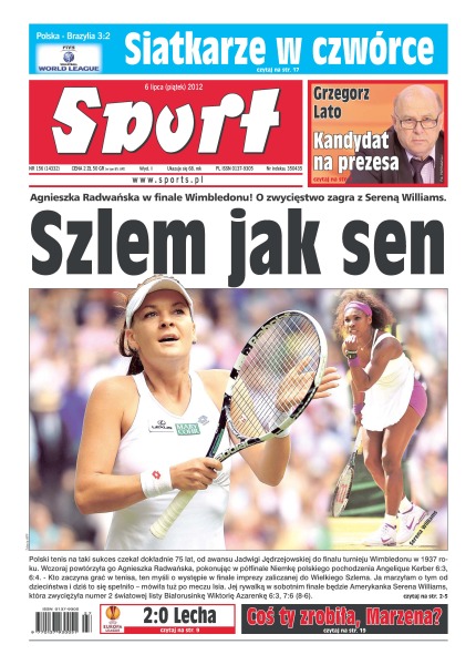 Agnieszka Radwańska w finale Wimbledonu – o zwycięstwo zagra z Sereną Williams; Fornalik, Skorża, Engel – 10 lipca wszystko będzie jasne; Grzegorz Lato będzie ponownie kandydował na fotel prezesa PZPN; Władimir Kliczko przed sobotnią walką z Tonym Thomsonem przekonuje, że z wiekiem jest coraz lepszy.