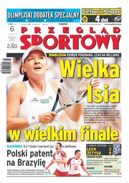 Agnieszka Radwańska jako pierwsza Polka od czasów Jadwigi Jędrzejowskiej zagra w Londynie w finale; w Sofii Polska pokonała Brazylię i niezależnie od wyniku dzisiejszego meczu z Kubą awansowała do półfinału LŚ; Marzena Karpińska stosowała nandrolon i nie pojedzie na igrzyska; Niemiec Andre Greipel wygrał 5. etap. – liderem nadal Szwajcar Fabian Cancellara.