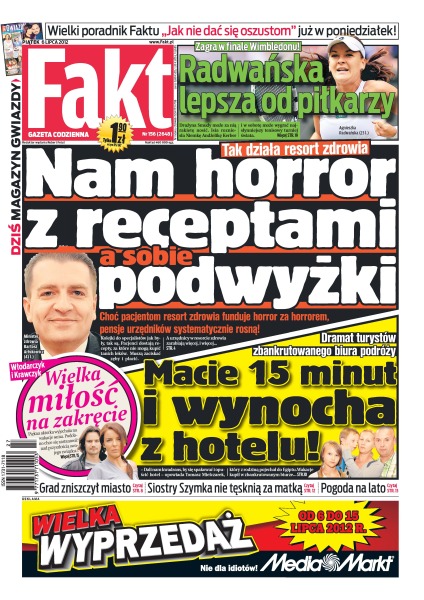 Choć pacjentom resort zdrowia funduje horror za horrorem, pensje urzędników systematycznie rosną; Włodarczyk i Krawczyk – piękna aktorka wyjechała na wakacje sama, podobno chce się zastanowić nad przyszłością swojego związku; siostry Szymka nie tęsknią za swoją matką; dramat turystów zbankrutowanego biura podróży; Agnieszka Radwańska zagra w finale Wimbledonu.