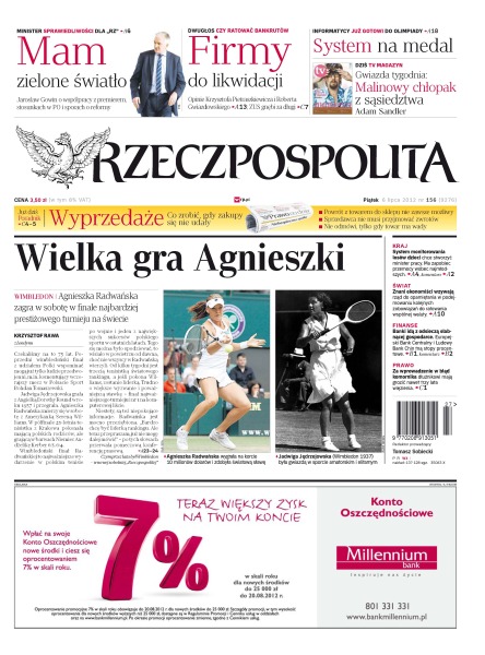 Agnieszka Radwańska zagra w sobotę w finale najbardziej prestiżowego turnieju na świecie – Wimbledonu; wyprzedaże – co zrobić, gdy zakupy się nie udały; firma do likwidacji – opinie Krzysztofa Pietraszkiewicza i Roberta Gwiazdowskiego; Jarosław Gowin o współpracy z premierem, stosunkach w PO i sporach o reformy; znani ekonomiści wzywają rząd do opamiętania w podejmowaniu kolejnych zobowiązań do ratowania wspólnej waluty.