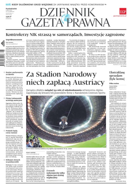 Kiedy dłużnikowi grozi więzienie za ukrywanie majątku przed komornikiem; kontrolerzy NIK straszą w samorządach – inwestycje zagrożone; zarządca Stadionu Narodowego zażądał 152 mln zł odszkodowania od koncernu Alpine – zapowiada się krwawy bój prawników firmy z Narodowym Centrum Sportu; białoruskie firmy wypracowały sposób pozwalający uniknąć presji UE; dlaczego podatki będą coraz wyższe; to już czwarty rok, kiedy część uczniów musi kupować nowe zestawy do nauczania.