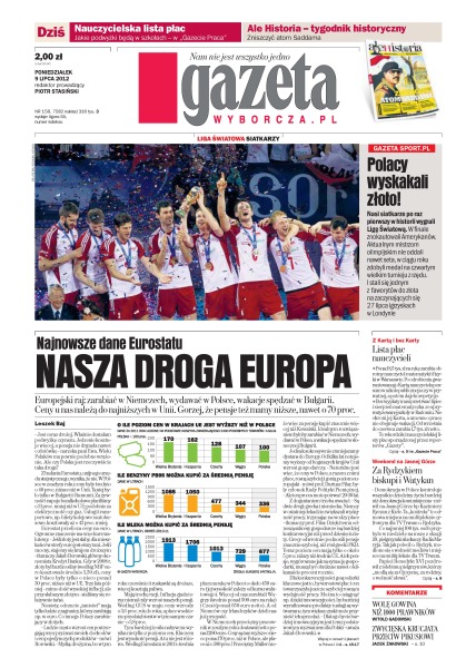 Nasi siatkarze po raz pierwszy w historii wygrali Ligę Światową; europejski raj: zarabiać w Niemczech, wydawać w Polsce, wakacje spędzać w Bułgarii – ceny u nas należą do najniższych w Unii – gorzej, że pensje też mamy niższe, nawet o 70 proc.; to sami sędziowie są głównymi sprawcami pomyłek sądowych – wynika z prekursorskich badań nad przyczynami niesłusznych skazań w Polsce; Libijczycy, którzy w sobotę po raz pierwszy od 60 lat poszli na wybory, tryskali entuzjazmem; trwają poszukiwania ciał ofiar gwałtownej powodzi, która w nocy z piątku na sobotę zabiła na czarnomorskim wybrzeżu Rosji co najmniej 171 osób; czy domy przyszłości będą bez kominów i kaloryferów; naukowcy z USA opracowali metodę bezpiecznego wstrzykiwania tlenu bezpośrednio do układu krążenia.