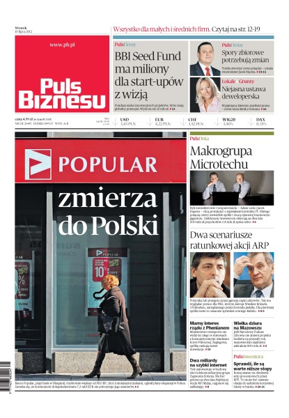 BBI Seed Fund ma miliony dla start-upów z wizją; Banco Popular, piąty bank w Hiszpanii, trzykrotnie większy od PKO BP, choć z mniejszymi zyskami, ogłosił plany ekspansji w Polsce; byli menedżerowie Computerlandu – Adam Leda i Jacek Kujawa – chcą powalczyć o największe kontrakty IT; dlaczego ministerstwo transportu nie widzi nic złego w interesach z komunistycznymi władzami Korei Północnej; jeśli Narodowy Fundusz Zdrowia nie zmieni projektu budżetu na przyszły rok, mazowieckim szpitalom zabraknie 800 mln zł.; ile zainwestuje w budowę sieci telekomunikacyjna grupa Zygmunta Solorza; rosną szanse na obniżenie stóp procentowych przez RPP.