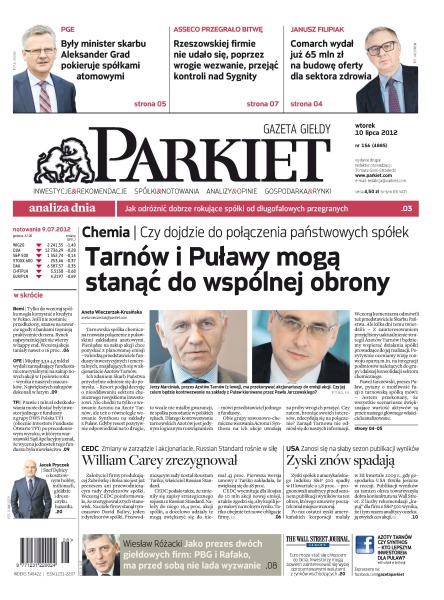 Tarnów i Puławy mogą stanąć do wspólnej obrony; co sprawia, że firmy dzieli taka przepaść, i na co zwracać uwagę, dobierając akcje do portfela; do niemal 43 proc. mogą wzrosnąć wkrótce udziały Russian Standard w producencie Bolsa i Żubrówki; brak zgody Urzędu Ochrony Konkurencji i Konsumentów oraz sprzeciw wiodących udziałowców Sygnity sprawił, że wrogie przejęcie, które planowało Asseco, nie doszło do skutku; między 3,3 a 4,5 mld zł wydali zarządzający funduszami emerytalnymi na zakup nowych akcji w pierwszej połowie roku; w USA rusza sezon publikacji wyników spółek za II kwartał, zdaniem analityków najsłabszy od czterech lat.