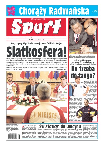 Zwycięzcy Ligi Światowej powrócili do kraju; dzisiaj w Warszawie okaże się, czy „Niebiescy” stracą swego trenera; Andrea Anastasi poprowadził reprezentację Polski w czterech imprezach i we wszystkich zdobył medal; Agnieszka Radwańska ma być pierwszą kobietą w roli chorążego polskiej reprezentacji podczas letnich igrzysk; wczorajszy etap jazdy indywidualnej na czas był popisem pary Brytyjczyków z ekipy Sky.