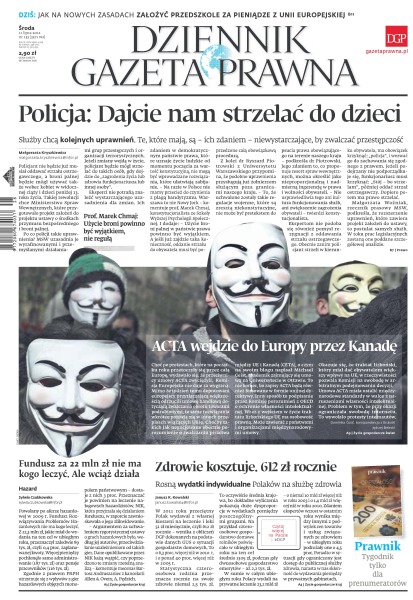 Jak na nowych zasadach założyć przedszkole za pieniądze Unii Europejskiej; służby chcą kolejnych uprawnień – te, które mają, są ich zdaniem niewystarczające, by zwalczać przestępczość; czy ACTA wejdzie do Europy przez Kanadę; rosną wydatki indywidualne Polaków na służbę zdrowia; powołany po aferze hazardowej w 2009 r. Fundusz Rozwiązywania Problemów Hazardowych nie ma kogo leczyć; rząd i GDDKiA chcą wreszcie zarabiać na nowych i wyremontowanych odcinkach dróg; Brytyjczycy i Polacy kłócą się na forum Unii z Niemcami; nowy prezes BPS ma skierować działalność banku na stare tory.