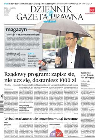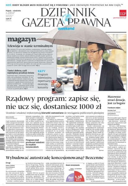 Kiedy bloger musi rozliczać się z fiskusem i jakie obowiązki podatkowe na nim ciążą; z powodu załamania wpływów z abonamentu oraz rosnącej konkurencji na rynku reklamy TVP zamknie ten rok gigantyczną stratą w wysokości ok. 60 mln zł; uczelnie i studenci wykorzystują kierunki zamawiane do wyciągania publicznych pieniędzy; pierwszy polski region dogonił rozwinięty Zachód – Mazowsze może jednak stracić z tego powodu część unijnych pieniędzy; na utrzymanie niespełna 500 km autostrad wydamy w tym roku 1,4 mld zł, czyli więcej niż na zadbanie o kondycję pozostałych 19 tys. km dróg krajowych; Kościół przegrywa majątek w sądzie; politycznie motywowane procesy na Ukrainie stały się normą i nie dotyczą tylko byłych ministrów.