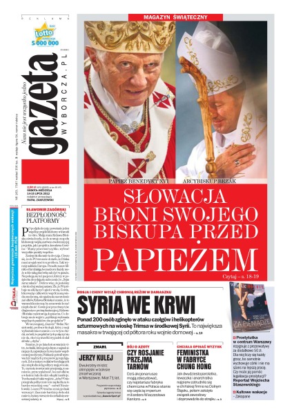 Ponad 200 osób zginęło w ataku czołgów i helikopterów szturmowych na wioskę Trimsa w środkowej Syrii; Jerzy Kulej dwukrotny mistrz olimpijski w boksie zmarł wczoraj w Warszawie – miał 71 lat; dziś akcjonariusze mogą zdecydować, czy najstarsza fabryka chemiczna w Polsce stanie się częścią imperium miliardera Wiaczesława Kantora; jak dwudziestoparolatka, lewaczka i anarchistka najpierw zatrudniła się w chińskiej firmie na Dolnym Śląsku, potem założyła związek zawodowy i doprowadziła do strajku; Słowacja broni swojego biskupa przed papieżem.