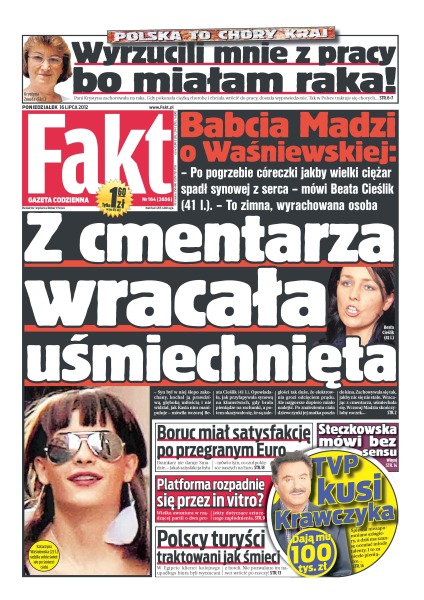 Co babcia Madzi myśli o synowej; trąba powietrzna przeszła nad Polską – drzewa łamały się niczym zapałki; Krystyna Żmuda straciła pracę, choć wygrała ze śmiertelną chorobą i po zwolnieniu lekarskim chciała wrócić za biurko; posłowie lewicy odwiedzili towarzyszy z Komunistycznej Partii Chin; koszmar klientów upadłego biura Alba Tour; Edyta Bartosiewicz wie, co jest dobre i dla ciała, i dla podniebienia; były bramkarz naszej kadry ostro podsumowuje okres, kiedy biało-czerwonych prowadził Franciszek Smuda; Borussia Dortmund za moment może stracić Roberta Lewandowskiego; Wisła Kraków od lat nie była tak bierna na rynku transferowym; Adam Kszczot wygrał, a Tomasz Majewski był drugi w zawodach Diamentowej Ligi.