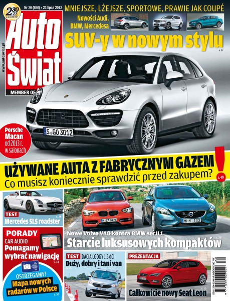 Porsche Macan, BMW X4, Mercedes GLK i Audi Q6 – nowa klasa kompaktowych SUV-ów; Seat Leon – kolejna generacja hiszpańskiego kompaktu; Toyota Prius+ - hybryda dla siedmiorga; Dacia Lodgy – dużo samochodu, mało pieniędzy; jak czyścić karoserię; która nawigacja GPS najlepiej spełnia Twoje potrzeby.