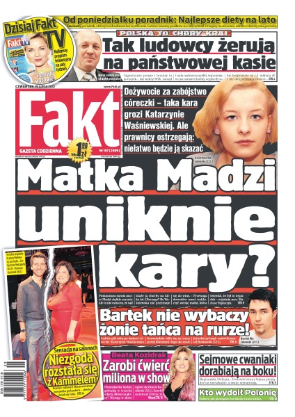 Dożywocie za zabójstwo córeczki – taka kara grozi Katarzynie Waśniewskiej, ale prawnicy ostrzegają: niełatwo będzie ją skazać; jak ludowcy żerują na państwowej kasie; nie ma już pieniędzy na dokończenie w Polsce sieci dróg – bez wsparcia Unii zbudujemy nowe trasy za 20 lat; ile Marek Sawicki zarobił na stanowisku ministra rolnictwa; jak sejmowe cwaniaki dorabiają na mieszkaniach; Niezgoda i Kammel się rozstali; Anna Popek zabrała swego ukochanego do Zakopanego; transakcja sprzedaży Polonii Warszawa wstrzymana – kibice GKS Katowice odkryli, że UEFA już trzy lata temu zakazała handlu licencjami; syn rosyjskiego oligarchy kupuje Lechię; Robert Lewandowski miałby zastąpić w AC Milan Zlatana Ibrahimovicia – tak spekulują włoskie gazety.