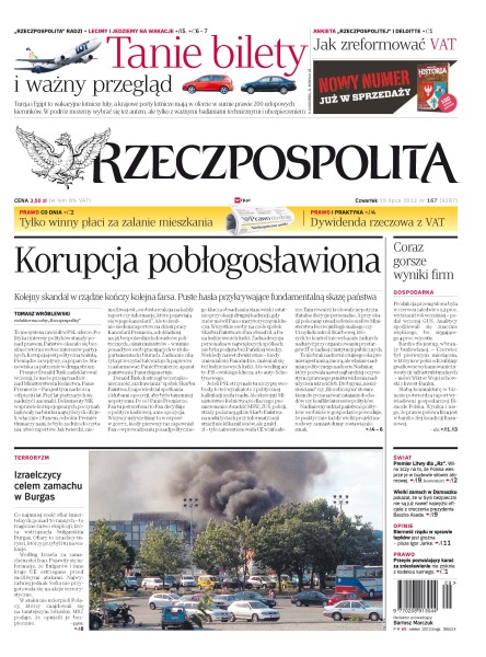 Gminy kultywują nauczycielski przywilej uznany za niekonstytucyjny – preferują dzieci pedagogów w rekrutacji do przedszkoli i szkół; premier chce walczyć z nepotyzmem w państwowych spółkach; zamach na Izraelczyków w bułgarskim Burgas oznacza, że Europa nie może czuć się spokojna; premier Andrius Kubilius przekonywał Donalda Tuska do udziału w budowie elektrowni; „Prometeusz” Ridleya Scotta to wizualny majstersztyk, ale nie sprostał legendzie otaczającej cykl o Obcym; Japończycy chcą wywiercić najgłębszą dziurę w skorupie naszej planety – ma sięgnąć 10 kilometrów; Śląsk wygrał z Buducnostą 2:0 – dziś mecze Legii, Ruchu i Lecha; spowolnienie w Europie odbija się wyraźnie na działalności firm – produkcja przemysłowa była w czerwcu zaledwie o 1,2 proc. wyższa niż rok temu.