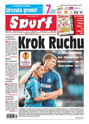 Zwycięstwo u siebie i dwa remisy na wyjeździe zanotowały polskie drużyny w 2. rundzie kwalifikacji Ligi Europejskiej; splądrowane bagaże gości, pobici rzecznik, dziennikarze i kibice, strzały z broni i spuszczone psy – tak wyglądała otoczka meczu II rundy kwalifikacji Ligi Mistrzów w stolicy Czarnogóry; rok po awarii czyli co ze Stadionem Śląskim; Zlatan Ibrahimović, często gwałtowny, ale i genialny, zamienił Mediolan na Paryż – w PSG będzie zarabiał 13,5 miliona euro rocznie; ciemne siły w polskim sporcie; Serbia, Słowenia, Korea Płd., Białoruś i Arabia Saudyjska będą przeciwnikami Polaków w fazie grupowej styczniowych mistrzostw świata w Hiszpanii; rośnie forma Łukasza Kubota przed najważniejszą imprezą sezonu.