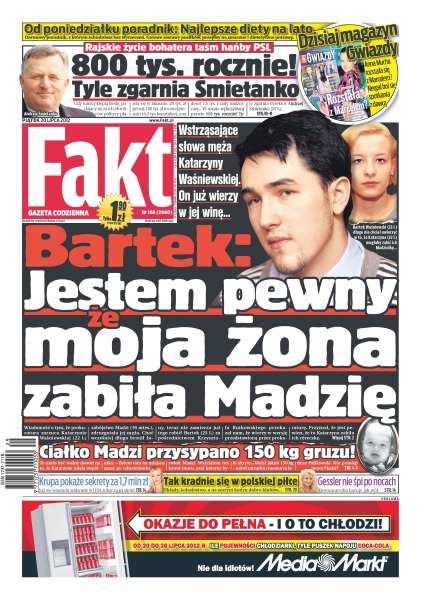 Wstrząsające słowa męża Katarzyny Waśniewskiej – on już wierzy w jej winę; ludowy działacz zarabiał rocznie prawie 800 tysięcy złotych w spółce skarbu państwa – na koszt firmy jeździł po całym świecie; Fakt sprawdził chińskie materace; już we wrześniu widzowie jednej z amerykańskich telewizji będą podglądać Joannę Krupę i jej rodzinę; Włodarczyk stawia warunki Krawczykowi; Ania Wiśniewska