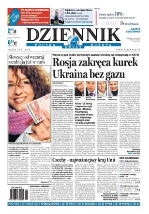 Wojna o gaz może zniweczyć szanse Ukrainy na integrację z NATO; od wczoraj Słowacy zarabiają w euro; Praga przejęła stery UE na najbliższe sześć miesięcy; odprawy w spółkach Skarbu Państwa sięgnęły w zeszłym roku 100 mln złotych; prezentujemy sylwetkę nowego szefa TVP; w Bielsku - Białej powstaje kreskówka o Koperniku; Tusk powinien zrobić przedterminowe wybory - wywiad z Andrzejem Celińskim. Dodatki: The Wall Street Journal, Warszawa, Kultura, Kultura TV.