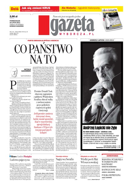 Premier Donald Tusk oburzony nagraniem z gabinetu Władysława Serafina obiecał walkę z zawłaszczaniem przez polityków rządowych spółek i instytucji; księstwo PSL to głównie stanowiska podległe dwóm resortom – Ministerstwu Rolnictwa i Gospodarki; najwięksi wydawcy grożą pozwem w związku z rządowym projektem e-podręczników; wielki pech Mai Włoszczowskiej – kolarka górska, kandydatka do medalu na igrzyskach prawdopodobnie nie pojedzie do Londynu.