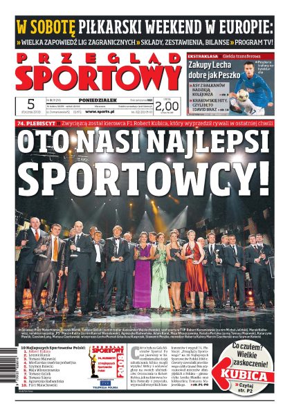 Robert Kubica najlepszym sportowcem Polski 2008 roku, wyprzedził rywali w ostatnich minutach głosowania; relacja z Gali Mistrzów Sportu; Boruc powinien zmienić klub - twierdzi w wywiadzie Andrzej Dawidziuk; kolejnym klubom grozi karna degradacja, a PZPN udaje, że nie ma problemu; Widzew i Korona Kielce chętnie zatrudnią Pawła Janasa; rozmowa z Andrzejem Mierzejewskim; większość trenerów jest zdania, że Małysz powinien nadal rywalizować w tegorocznym TCS.