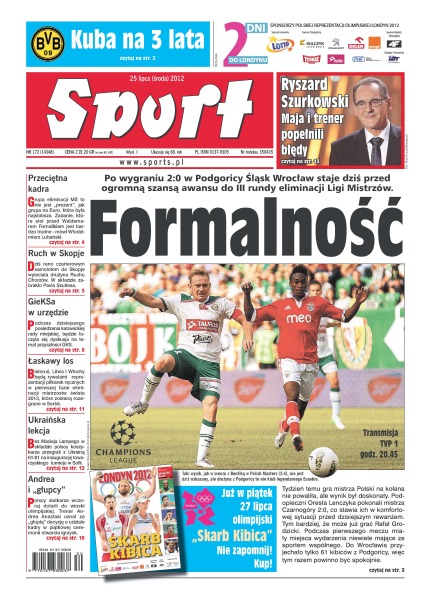 Śląsk Wrocław staje dziś przed ogromną szansą awansu do III rundy eliminacji Ligi Mistrzów; Jakub Błaszczykowski przedłużył kontrakt z Borussią Dortmund o kolejne trzy lata; piłkarze rozpoczną zmagania sportowców na igrzyskach w Londynie; polski kolarz wszech czasów krytykuje Maję Włoszczowską i ludzi odpowiedzialnych za jej przygotowania do igrzysk.