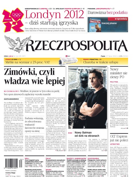 Dzisiaj rano zabiły dzwony, wieczorem będzie ceremonia otwarcia – zaczynają się olimpijskie dwa tygodnie; możliwe, że jeszcze w tym roku za jazdę bez opon zimowych zapłacimy wysoki mandat; kandydat PSL na szefa resortu rolnictwa nie pasuje Platformie; kryzys zmusza francuskich socjalistów do działań sprzecznych z ich ideologią; premier David Cameron coraz mocniej skręca w lewo – napotyka to opór tradycyjnego elektoratu i Kościoła; na ekrany wchodzi „Mroczny rycerz powstaje” – odbiór filmu zmienił się po tragedii w Denver; solarium jest niebezpieczne dla życia – wynika z najnowszych badań; Andrea Anastasi staje przed najtrudniejszym zadaniem w trenerskim życiu – ma zdobyć olimpijski medal dla zakochanej w siatkarzach Polski; pod koniec sierpnia ceny na stacjach benzynowych powinny wrócić do poziomu z początku wakacji – potem czekają nas kolejne podwyżki.