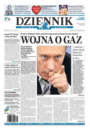 Władimir Putin pozwolił Gazpromowi odciąć Europę od gazu; nowe władze TVP ostro biorą się za publicystykę, z ramówki ma zniknąć "Misja specjalna"; czołgi zaatakowały szkołę w Strefie Gazy; po kilku dniach mrozów czekają nas śnieżyce i wichury; resort finansów odda VAT od SMS-ów dla Owsiaka; upadł ośrodek dla kobiet zmuszanych do prostytucji, ofiary handlarzy ludźmi tracą szansę na pomoc; w jaki sposób dokarmiać ptaki, żeby im nie szkodzić; premiera "Wesela Figara" we wrocławskiej operze. Dodatki: The Wall Street Journal, Warszawa.