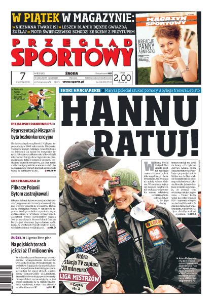 Małysz poleciał szukać pomocy u Hannu Lepisto; rozmowa z fizjologiem Janem Chmurą; piłkarze Polonii Bytom nie wyszli na trening, klub jest im winien 300 tyś. zł; Widzew uniknie degradacji; Brazylijczyk Beto wzmocni skład Wisły Kraków; Stilić wiosną grać będzie u nas - wywiad z prezesem Lecha Poznań; na polskich torach żużlowych jeździ aż siedemnastu milionerów; Mateja to dobry trener - mówi Maciej Kot; Wolfgang Loitzl zwycięzcą Turnieju Czterech Skoczni.