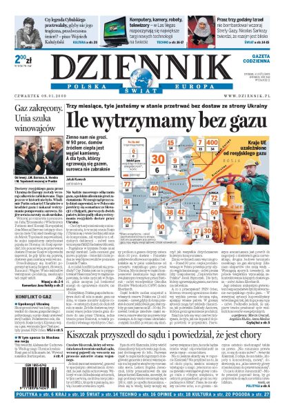 Już ponad połowa Unii jest odcięta od dostaw gazu; bez dostaw gazu ze strony Ukrainy jesteśmy w stanie przetrwać trzy miesiące; to Rosjanie mają rację - rozmowa z Aleksandrem Gudzowatym; Czesław Kiszczak pojawił się w końcu na rozprawie autorów stanu wojennego i przedstawił zaświadczenie o chorobie; wywiad z Piotrem Farfałem; Izrael łagodzi ataki na Strefę Gazy; sylwetka Aleksandra Grada; polska izba wytrzeźwień to postrach dla Anglików. Dodatki: The Wall Street Journal, Warszawa.