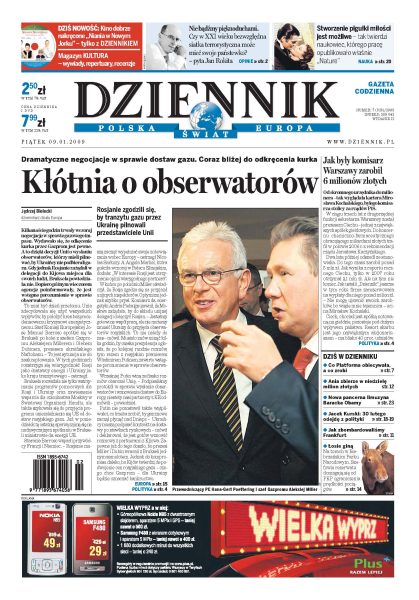 Dramatyczne negocjacje w sprawie dostaw gazu, coraz bliżej do odkręcenia kurka; Mirosław Kochalski - milioner dzięki PiS; Danuta Wałęsa patronuje akcji na rzecz walki z rakiem szyjki macicy; partia Donalda Tuska ma poważne problemy z przeforsowaniem reform społecznych; w grudniu liczba bezrobotnych wzrosła prawie o 76 tys. osób; prawie połowa Polaków przyznaje się, że bierze lewe zwolnienia z pracy; łosie w Biebrzańskim Parku Narodowym giną na torach; oddala się pokój na Bliskim Wschodzie. Dodatki: The Wall Street Journal, Warszawa, Kultura, Kultura TV.