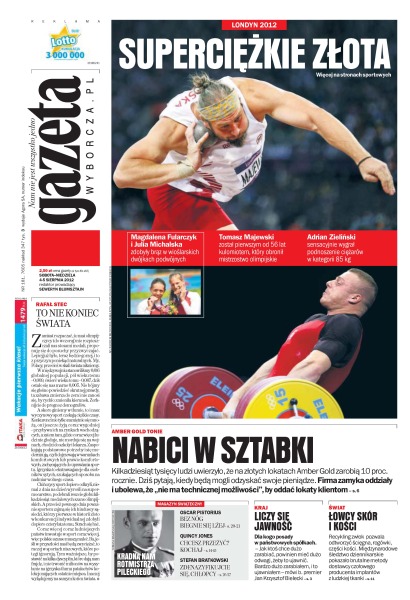Kilkadziesiąt tysięcy ludzi uwierzyło, że na złotych lokatach Amber Gold zarobią 10 proc. rocznie. – dziś pytają, kiedy będą mogli odzyskać swoje pieniądze; dla kogo posady w państwowych spółkach; międzynarodowe śledztwo dziennikarskie pokazało brutalne metody dostawcy czołowego producenta implantów z ludzkiej tkanki; Tomasz Majewski został pierwszym od 56 lat kulomiotem, który obronił mistrzostwo olimpijskie; Adrian Zieliński sensacyjnie wygrał podnoszenie ciężarów w kategorii 85 kg; Magdalena Fularczyk i Julia Michalska zdobyły brąz w wioślarskich dwójkach podwójnych.