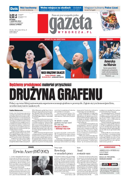 Polacy są coraz bliżej zastosowania supernowoczesnego grafenu w przemyśle – zajmie się tym konsorcjum firm, uczelni i instytutów naukowych; psychiatrzy ocenili, że laryngolog, choć molestuje pacjentki, nie chce ich krzywdy; syryjski premier opuścił kraj i uciekł do Jordanii; Erwin Axer zmarł w niedzielę w nocy w Warszawie – miał 95 lat; urlopy, ochrona, zasiłki, czyli prawa pracującej mamy; jeśli chcesz zapewnić dziecku naprawdę dobry start w dorosłe życie, niezależnie od bieżących wydatków gromadź kapitał z myślą o przyszłości swojej pociechy; Damian Janikowski został brązowym medalistą w zapasach w kategorii 84 kg; Bartłomiej Bonk wykorzystał niezwykłą szansę, pięknie walczył i zdobył brąz.