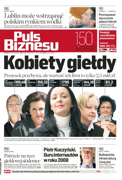 Piotr Kuczyński został wybrany "Guru 2008 roku", feminizacja: panie stoją na czele zarządów 11 spółek z GPW, Polmos Lublin ma szansę przegonić nie tylko grupę Sobieski, ale i CEDC, ministerstwo finansów podało proste i jasne zasady odliczania VAT-u od paliw i aut, inwestycje infrastrukturalne i pieniądze z Unii staną się lekiem na kryzys gospodarczy, ceny mieszkań spadły w ciągu pół roku o 23% - deweloperzy odgrażają się, że taniej nie będzie.